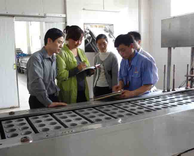 圖為馬所長在靈山石塘才藝食品機(jī)械有限公司與技術(shù)人員進(jìn)行交流