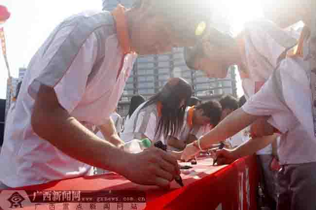 大學(xué)生在印有“拒絕盜版 助力創(chuàng)新”的條幅上簽名
