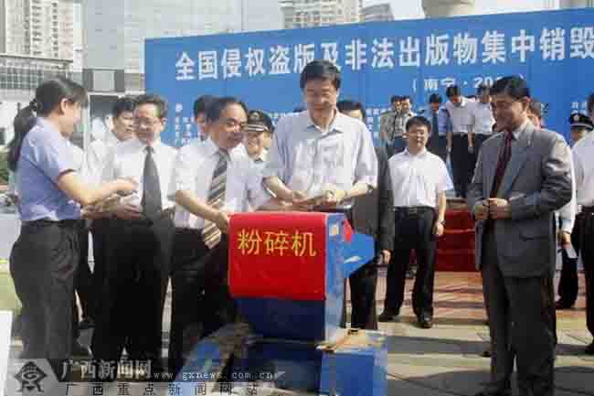 根據(jù)全國(guó)“掃黃打非”工作小組辦公室統(tǒng)一部署,4月22日,廣西“掃黃打非”工作小組在南寧市設(shè)2012年全國(guó)侵權(quán)盜版和非法出版物集中銷(xiāo)毀活動(dòng)主會(huì)場(chǎng),在全區(qū)其他13個(gè)市設(shè)分會(huì)場(chǎng),公開(kāi)銷(xiāo)毀85萬(wàn)件侵權(quán)盜版和非法出版物,以此警示、震懾違法犯罪分子和非法經(jīng)營(yíng)者,以實(shí)際行動(dòng)迎接“4•26”世界知識(shí)產(chǎn)權(quán)日。當(dāng)日,自治區(qū)黨委常委、宣傳部長(zhǎng)、自治區(qū)“掃黃打非”工作小組組長(zhǎng)沈北海與駐桂領(lǐng)事館文化官員、區(qū)市“掃黃打非”工作小組領(lǐng)導(dǎo)及成員單位共同場(chǎng)上銷(xiāo)毀侵權(quán)盜版制品,并向?qū)W生代表贈(zèng)送圖書(shū)和“綠書(shū)簽”,眾多相關(guān)從業(yè)人員及大學(xué)生在印有“拒絕盜版 助力創(chuàng)新”的條幅上簽名。